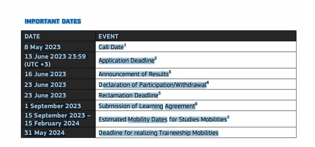 ATTENTION All the study mobilities are obligated to be realized in the fall term of 2023-2024 Academic Year from 15 September 2023 to 15 February 2024. The deadline to realise the traineeship mobilities is 31 May 2024.